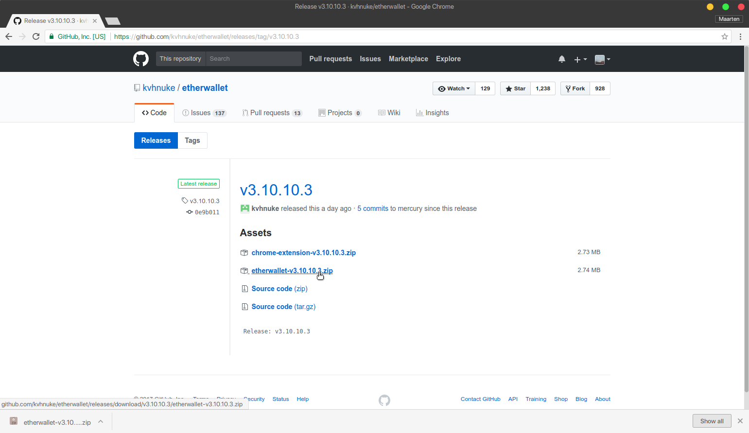 In order to setup your local MyEtherWallet, start off by downloading the latest release of MyEtherWallet here. Click on etherwallet-vX.X.X.X.zip, to download the file. Move this file to a USB stick or something similar, in order to move it to your offline computer.