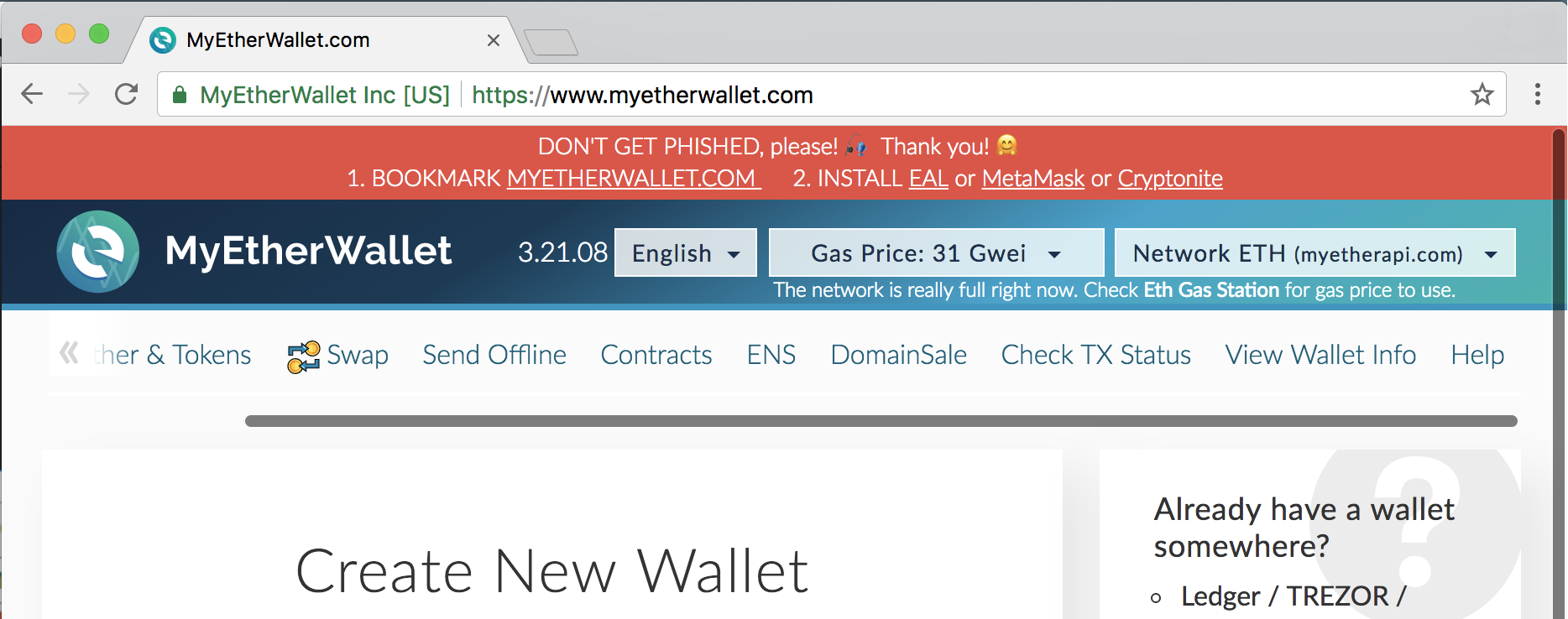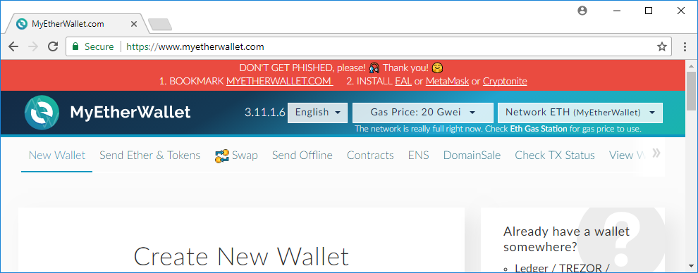 Now, if you restart your browser, you should be able to see the EV SSL on MyEtherWallet.